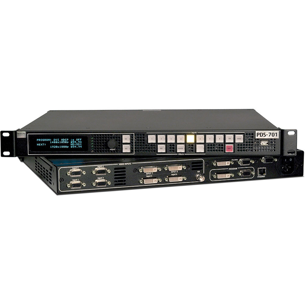 2 Ausgänge: 2 x Programm oder 1 x Programm + 1 x Vorschau: 2x DVI 2048×1152@60Hz, 2x VGA 2048×1152@60Hz